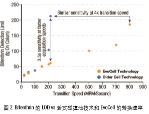 提高M(jìn)S 采集速率的一個(gè)風(fēng)險(xiǎn)在于,分析性能有可能因此降低,甚至導(dǎo)致整個(gè)方法不再適合分析任務(wù)。對(duì)于多農(nóng)殘分析方法來(lái)說(shuō),分析需求是要在單次運(yùn)行中測(cè)量大 量的化合物(100-350),并且檢測(cè)水平必須達(dá)到10 ppb甚至更低。在不同的轉(zhuǎn)換速度下測(cè)定了農(nóng)藥bifenthrin的檢出限 (LOD), 以觀察轉(zhuǎn)換速度提高(可高達(dá) 800SRM/s)對(duì)在低水平下精確檢測(cè)化合物帶來(lái)的影響。同時(shí)還用老式碰撞池技術(shù) 對(duì)本實(shí)驗(yàn)進(jìn)行了重復(fù)。圖2展示了這些實(shí)驗(yàn)得到的數(shù)據(jù)。數(shù)據(jù)顯示出,檢測(cè)限如預(yù)期般隨著轉(zhuǎn)換速度的升高而提 高,對(duì)老式碰撞池技術(shù)(無(wú)法測(cè)定超過(guò) 200 SRM/s)和 EvoCell 均如此。然而,較之老式碰撞池技術(shù),EvoCell 在 4 倍轉(zhuǎn)換速率下達(dá)到相近的靈敏度,而在 200 SRM/s 下的 靈敏度也達(dá)到了老式技術(shù)的3.5 倍。