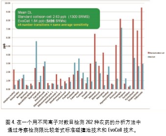 使用 EvoCell 技術(shù)能夠?qū)?SRM 離子對(duì)數(shù)目提高至四倍,上 圖檢測(cè)的離子對(duì)數(shù)目為5496(圖 4)。使用EvoCell 對(duì)所 有 262 種化合物進(jìn)行分析得到的(平均)LOD (1.84 ppb) 低 于使用老式碰撞池技術(shù)檢測(cè)1300 對(duì) SRM 離子對(duì)得到的 LOD(2.63 ppb)。這證明,在滿足這些化合物所需達(dá)到的 檢測(cè)水平后,仍有可能通過(guò)利用快速的 SRM 轉(zhuǎn)換速率來(lái)提高方法容量。