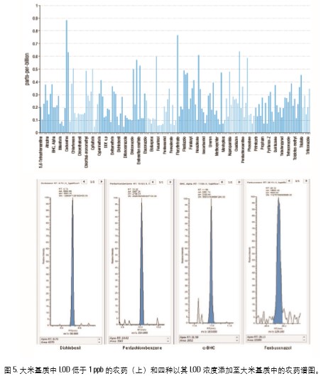我們針對(duì)大米基質(zhì)中的262 種農(nóng)藥,以每種農(nóng)藥2 至 3個(gè)離子對(duì)的水平進(jìn)行了考察。大部分農(nóng)藥都能在基質(zhì)水 平遠(yuǎn)低于 1ppb 的情況下進(jìn)行定量,并且表現(xiàn)出很好的選 擇性(圖 5)。