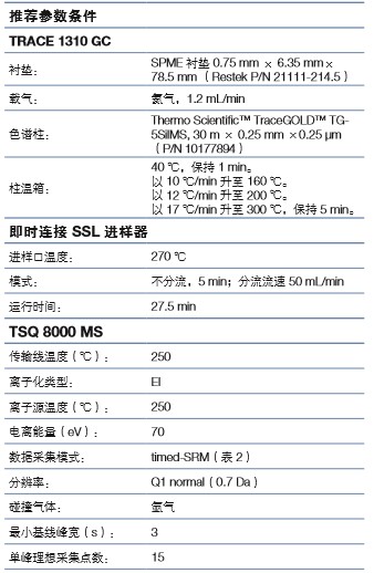本次實(shí)驗(yàn)應(yīng)用 Thermo Scientific™ TSQ™ 8000 GC-MS/MS 質(zhì) 譜儀聯(lián)用配備有 Thermo Scientific™ TriPlus™ RSH 自動(dòng)進(jìn)樣 器和 SPME(SPME NL: 50.5 mm)模塊的 Thermo Scientific™ TRACE™ 1310 氣相色譜儀系統(tǒng)進(jìn)行測(cè)試分析。氣相色譜分離采 用 Thermo Scientific™ TraceGOLD™ TG-5SilMS 色譜柱(30 m × 0.25 mm × 0.25 µm, P/N 10177894)。用于定量和確證的原始數(shù) 據(jù)則通過(guò) Thermo Scientific™ TraceFinder™ 3.2 軟件中的智能定時(shí) 掃描(timed-SRM)模塊采集。