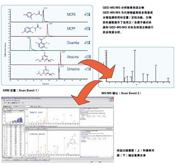 一次進樣,就可以獲得同時定性定量的數(shù)據(jù),利用QED/RER技術(shù),獲得二級全掃描譜圖,搜庫定性確認。