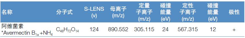 * 特別說明:正模式,還存在Avermectin B1a+Na 峰(m/z 895.39),但是,加Na 峰豐度受諸多因素影響,用于定量要慎重;負(fù)模式,存在Avermectin B1a-H 峰(m/z 871.48),有時(shí)也會選取減H 峰進(jìn)行定量。