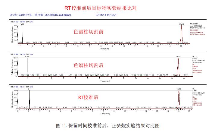 使用 Thermo Retention Time Alignment 軟件, 我們能夠?qū)φ锿榈谋A魰r間進(jìn)行準(zhǔn)確校準(zhǔn), 目標(biāo)物保留時間校準(zhǔn)前后實(shí)驗(yàn)比對如圖 11 所示: