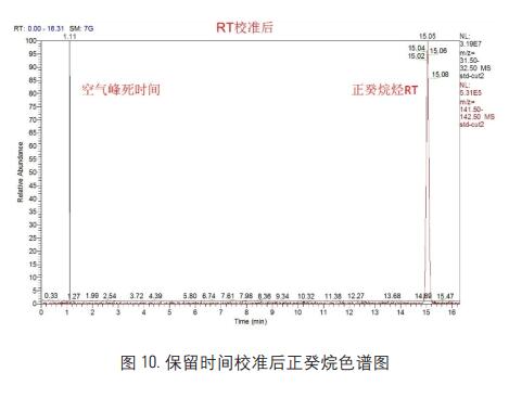 在進(jìn)行保留時間校準(zhǔn)后, 對正癸烷標(biāo)準(zhǔn)品進(jìn)行第三次數(shù)據(jù)采集, 數(shù)據(jù)結(jié)果如圖 10 所示: