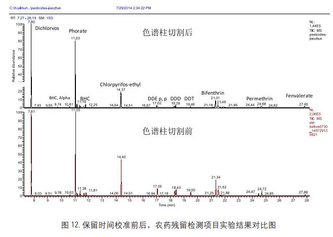Alignment 軟件, 使得目標(biāo)化合物在色譜柱進(jìn)行柱頭切割維護(hù)后, 保留時間保持不變, 保證數(shù)據(jù)處理方法穩(wěn)定,提高了多農(nóng)殘檢測分析的工作效率。