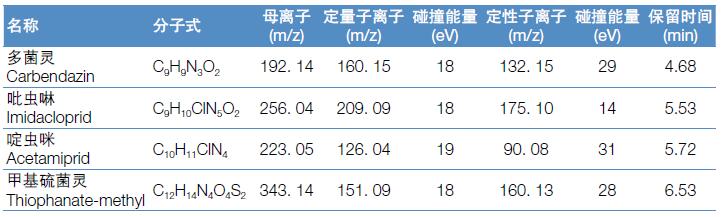 多菌靈、吡蟲啉、啶蟲脒和甲基硫菌靈作為高效、低毒、廣譜性殺蟲或殺菌劑,被廣泛用于水果、蔬菜的病蟲防害。本文參考NY/T 1453-2007、SN/T 2073-2008 和SN/T 3650-2013 開發(fā)了快速檢測多菌靈、吡蟲啉、啶蟲脒與甲基硫菌靈的殘留量的儀器方法,外標(biāo)法定量。