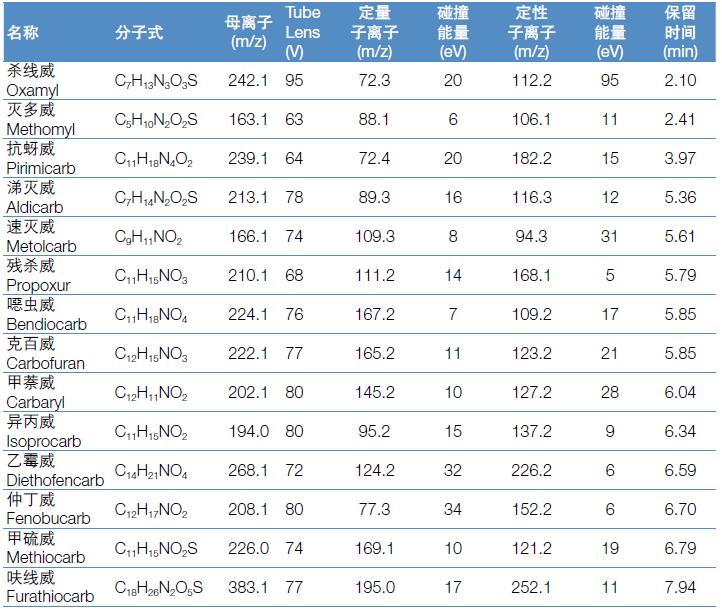 GB2763-2014 對(duì)氨基甲酸酯類農(nóng)藥的最大殘留限量規(guī)定為0.01-1 mg/kg,本方法完全能夠滿足國(guó)內(nèi)和國(guó)際法規(guī)標(biāo)準(zhǔn)對(duì)于常規(guī)法規(guī)檢測(cè)方法靈敏度、重現(xiàn)性的要求。