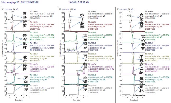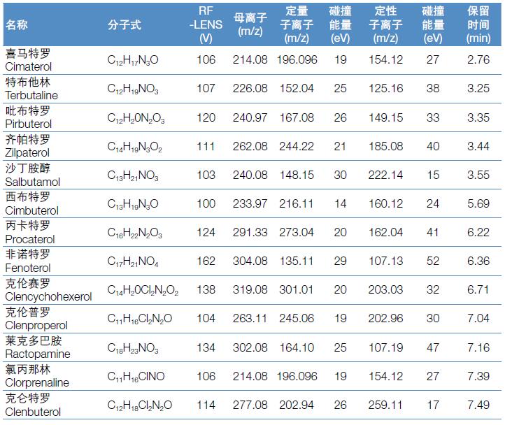 在我國(guó)禁用的“瘦肉精”種類有16 種,上述國(guó)標(biāo)檢測(cè)方法的檢出限為10 μg/kg,定量限為50 μg/kg。本方法不僅包括16種禁用的“瘦肉精”品種,還包括10 種可能作為“瘦肉精”用途的β- 受體激動(dòng)劑,并且完全能夠滿足國(guó)內(nèi)和國(guó)際法規(guī)標(biāo)準(zhǔn)對(duì)于常規(guī)法規(guī)檢測(cè)方法靈敏度、重現(xiàn)性的要求。