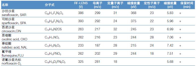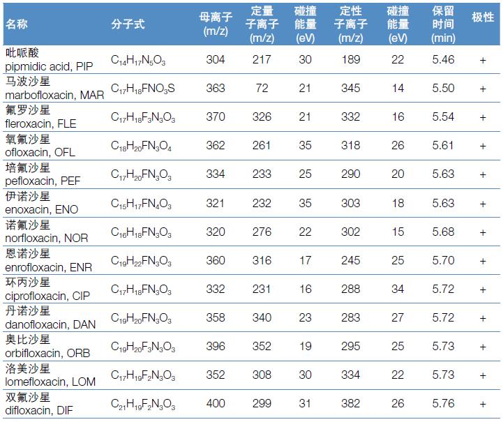 上述國標(biāo)檢測方法中,氟喹諾酮類藥物不同基質(zhì)中的檢出限為1.0-2.5 μg/kg。本方法完全能夠滿足國內(nèi)和國際法規(guī)標(biāo)準(zhǔn)對于常規(guī)法規(guī)檢測方法靈敏度、重現(xiàn)性的要求。