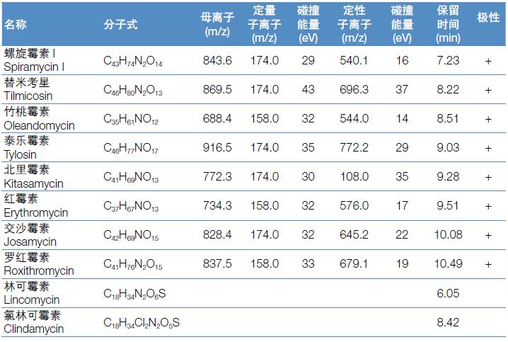 上述國(guó)標(biāo)檢測(cè)方法中,大環(huán)內(nèi)酯類(lèi)和林可胺類(lèi)藥物在不同基質(zhì)中的檢出限為0.1-10.0 μg/kg。本方法完全能夠滿足國(guó)內(nèi)和國(guó)際法規(guī)標(biāo)準(zhǔn)對(duì)于常規(guī)法規(guī)檢測(cè)方法靈敏度、重現(xiàn)性的要求。