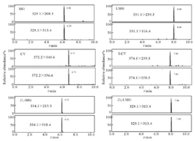 上述國(guó)標(biāo)檢測(cè)方法中,孔雀石綠(malachite green) 和結(jié)晶紫(crystal violet)在不同基質(zhì)中的檢出限為2.0-10.0 μg/kg。本方法完全能夠滿足國(guó)內(nèi)和國(guó)際法規(guī)標(biāo)準(zhǔn)對(duì)于常規(guī)法規(guī)檢測(cè)方法靈敏度、重現(xiàn)性的要求。