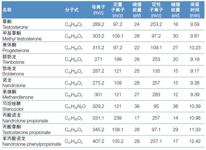 雄激素又稱甾體類同化激素(anabolic steroids, ASs)。本文參考GBT 21981-2008、SNT2677-2010、農(nóng)業(yè)部1068 號公告-3-2008,開發(fā)了一個(gè)快速檢測11 種同化激素藥物殘留量的儀器方法,外標(biāo)法定量。