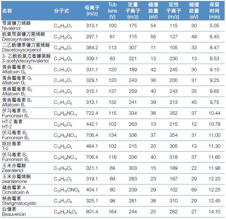 真菌毒素是由產(chǎn)毒真菌在適宜的環(huán)境條件下產(chǎn)生的有毒代謝產(chǎn)物。日常檢測(cè)樣品涉及奶制品、堅(jiān)果、飼料等。本文參考NY/T 1970-2010、NY/T 2071-2011、SN/T 3136-2012,開(kāi)發(fā)了快速檢測(cè)18 種真菌毒素殘留量的儀器方法,外標(biāo)法定量。