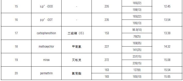 圖3. 50ppb20 種農(nóng)殘的定量離子色譜圖,其中Carbophenothion(三硫磷)為內(nèi)標(biāo)