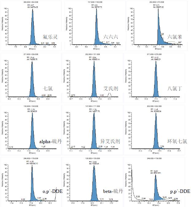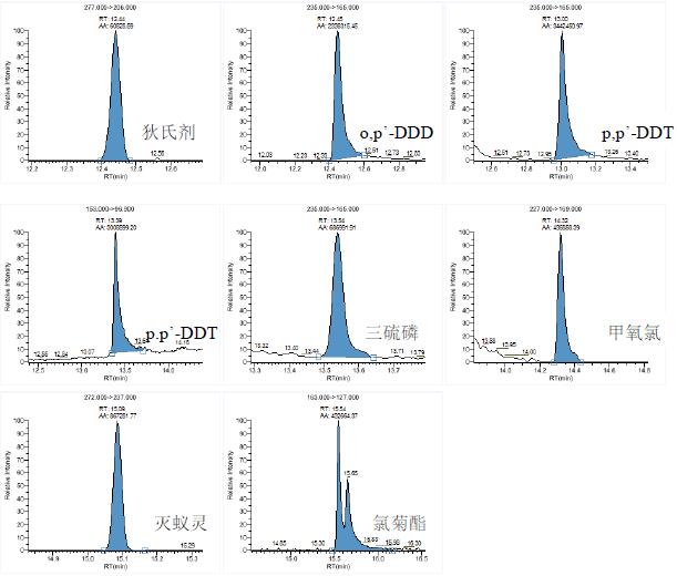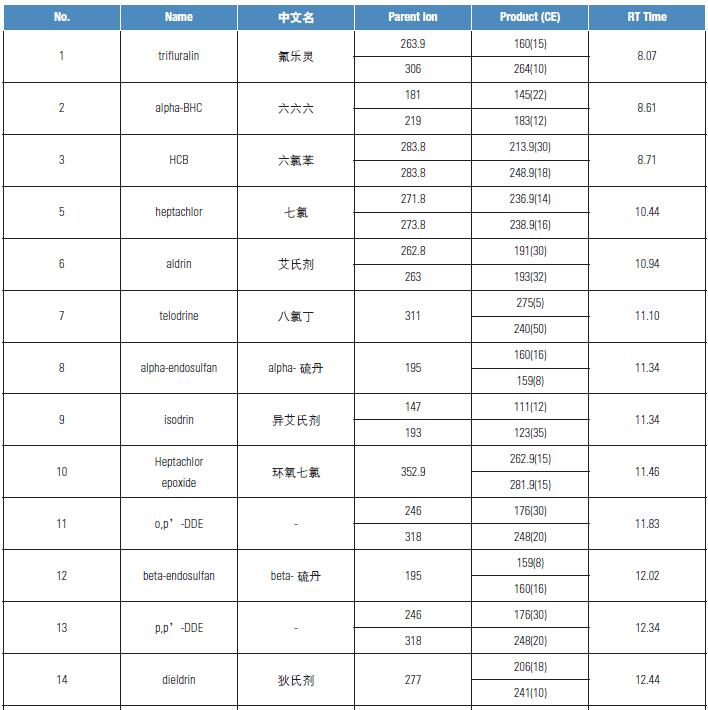 目前,對(duì)于多農(nóng)殘檢測(cè)分析多集中在食品安全和環(huán)境安全的范疇,但是隨著科學(xué)的發(fā)展,生活的進(jìn)步,我們開始放眼于那些我們不曾注意但是與我們又息息相關(guān)的領(lǐng)域。例如,在天然植物纖維的種植過程中會(huì)用到多種農(nóng)藥( 如殺蟲劑、除草劑等),在紡織品加工過程中絕大部分被除去,但仍可能有部分殘留在最終產(chǎn)品上。雖然農(nóng)藥的危害因其毒性和殘留量有關(guān),但其則極易被人體皮膚吸收并引發(fā)不良反應(yīng)。目前,國(guó)際上還沒有針對(duì)紡織品中農(nóng)藥殘留的檢測(cè)技術(shù)和通用的分析方法,但是隨著檢測(cè)技術(shù)的逐步發(fā)展,檢測(cè)紡織品的農(nóng)殘含量可能會(huì)成為又一個(gè)新的關(guān)注的課題。近年來,也有越來越多的文章開始關(guān)注紡織品中農(nóng)殘的檢測(cè),涉及到多種檢測(cè)方法,常用氣相檢測(cè)方法或者氣相色譜單四極桿氣質(zhì)聯(lián)用儀檢測(cè),應(yīng)用三重四極桿進(jìn)行檢測(cè)的方法卻不是很多(1-3)。
