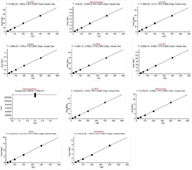 本實(shí)驗(yàn)用TSQ 8000 結(jié)合高惰性的弱極性色譜柱進(jìn)行多農(nóng)殘的分析檢測(cè),對(duì)生態(tài)紡織織物中的多種農(nóng)藥殘留進(jìn)行了測(cè)定,為紡織品農(nóng)殘檢測(cè)提供了有效手段得到了非常出色的結(jié)果。方法的線性范圍從20ppb 到400ppb,50ppb基質(zhì)加標(biāo)樣品連續(xù)3 針進(jìn)樣的RSD% 在1.82%-7.63% 之間。