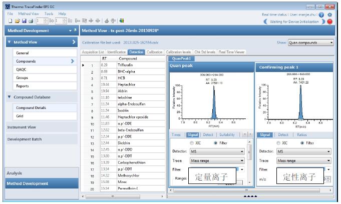 TSQ 8000 是賽默飛世爾科技全新一代三重四極桿氣相色譜質(zhì)譜聯(lián)用儀,具有極高的性能,包括超高的靈敏度,穩(wěn)定性以及良好的抗污染能力。本次實(shí)驗(yàn)所檢測(cè)的20 種常見的農(nóng)藥,線性范圍在20ppb-400ppb 之間,RSD 均在1.82%-7.63% 之間。TraceFinder 軟件可以簡(jiǎn)化MS/MS 過程,使進(jìn)樣方法編輯和數(shù)據(jù)處理方法編輯過程都更加簡(jiǎn)便,增強(qiáng)系統(tǒng)的適應(yīng)性。同時(shí),TraceFinder 軟件也可以為每個(gè)化合物提供至少兩對(duì)離子的檢測(cè)結(jié)果查看(包括定量離子和定性離子色譜圖),從而為化合物的在定性定量檢測(cè)提供更準(zhǔn)確的結(jié)果,避免假陽(yáng)性的出現(xiàn)。