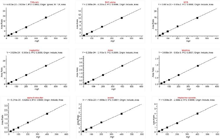 圖4. 20 種農(nóng)殘的標(biāo)準(zhǔn)曲線,其中Carbophenothion(三硫磷)為內(nèi)標(biāo)