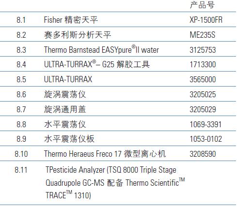 本文方法中樣品前處理采用QuEChERS 試劑盒,樣品測定采用最新開發(fā)的Thermo ScientificTM TSQTM 8000 PesticideAnalyzer 系統(tǒng),并采用Thermo ScientificTM TraceFinderTM 軟件進行快速的數(shù)據(jù)分析。本文介紹了完整的多農(nóng)藥殘留的測定方法的內(nèi)部方法驗證結(jié)果,以及對方法性能參數(shù)的評估。