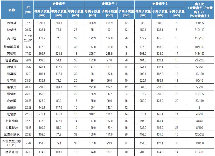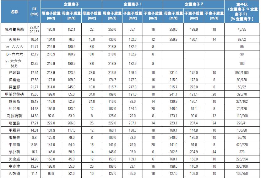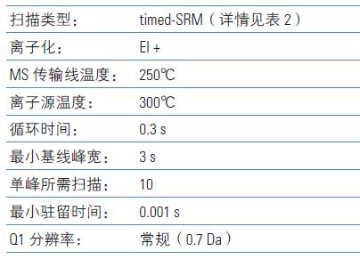 質(zhì)譜檢測使用TSQ 8000 三重四極桿質(zhì)譜儀的Timed-SRM 模式完成。所有的方法和SRM 設(shè)置來自Thermo Scientific TSQ8000 Pesticide Analyzer 系統(tǒng)6。離子比值根據(jù)每種待測基質(zhì)進行修改和設(shè)置。