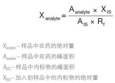 目標(biāo)農(nóng)藥的定量采用內(nèi)標(biāo)法。相對響應(yīng)因子(Rf)的定義見如下列方程。按照如下方程計算最終結(jié)果。