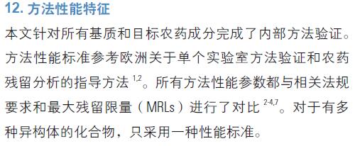 本文完成了用于日常農(nóng)藥殘留測定的方法的完整內(nèi)部驗證。研究的目的是客觀可靠地評價一種廣泛使用和接受的樣品前處理方法配合先進的分析儀器的方法分析性能。方法性能參數(shù)顯示大多數(shù)目標(biāo)化合物的性能符合現(xiàn)行法規(guī)的要求。采用獨立的外部質(zhì)量控制材料提高了測定結(jié)果的可信賴程度。在一些情況下,由于化合物的特性和基質(zhì)對分析結(jié)果的較大影響,無法確定方法性能參數(shù)或者測定值落到目標(biāo)范圍以外。對這些化合物(在相關(guān)基質(zhì)中),必須單獨優(yōu)化前處理方法(額外或特殊的凈化)和儀器分析方法。從實際操作上來說(特別是針對不穩(wěn)定或活性化合物),可以在每40-50 次進樣后更換襯管(和隔墊)以獲得最佳的性能?偠灾少惸w世爾科技提供的完整工作流程解決方案連同最新開發(fā)的TSQ 8000GC-MS/MS 系統(tǒng)為目標(biāo)化合物的分析和準(zhǔn)確定量帶來了良好的系統(tǒng)性能,特別是在靈敏度、選擇性和回收率方面。