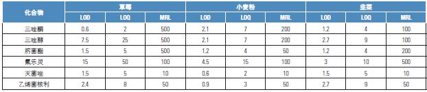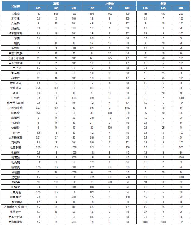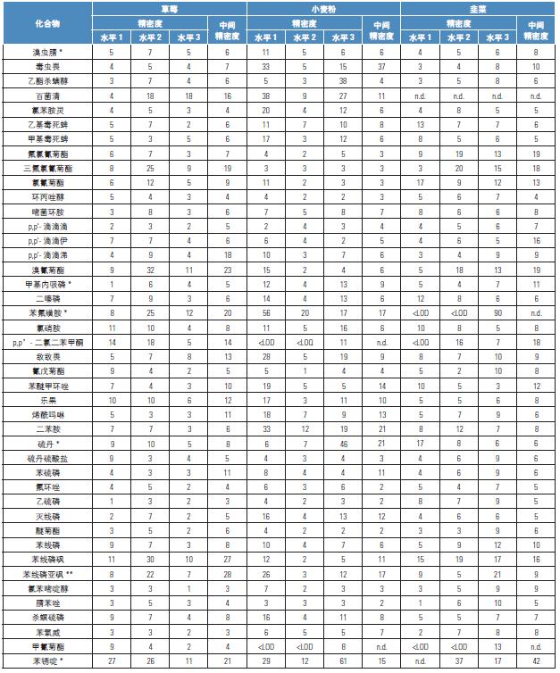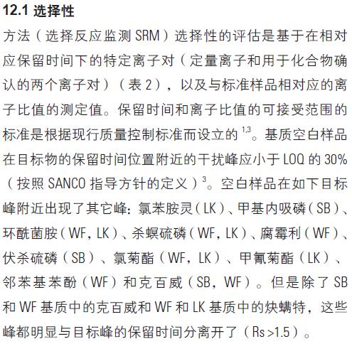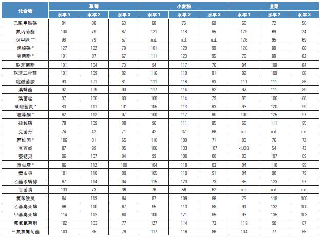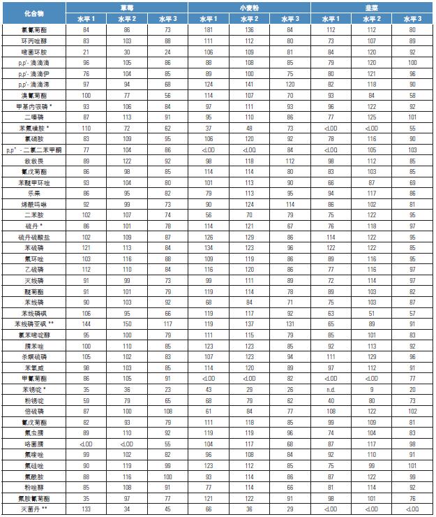 注意:FAPAS 樣品的選擇主要是基于目標(biāo)農(nóng)藥成分的含量。但是由于樣品有限,選擇的基質(zhì)與驗證的基質(zhì)稍有不同。