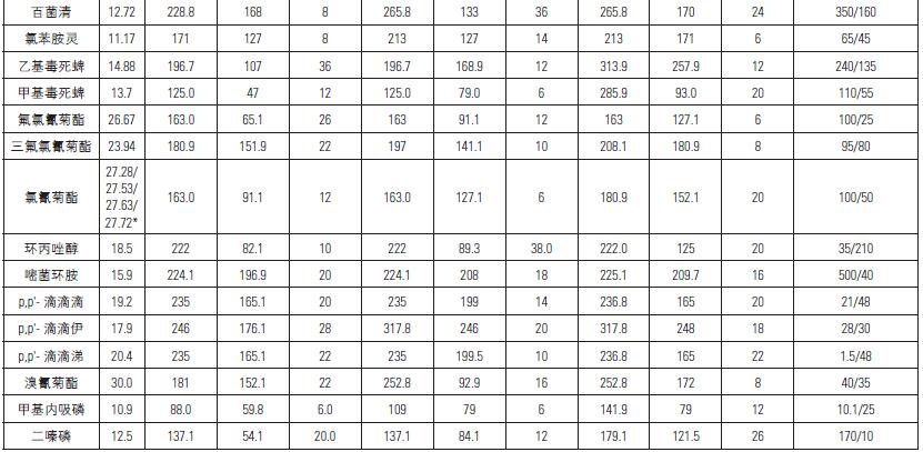 樣品測定采用TRACE 1310 氣相色譜與TSQ 8000 三重四極桿質(zhì)譜儀聯(lián)用技術(shù)(農(nóng)藥殘留分析手冊)。儀器控制、數(shù)據(jù)采集、數(shù)據(jù)處理和報告采用TraceFinder 3.1 軟件。
