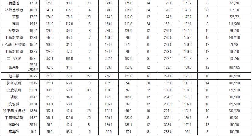 所有單個的農(nóng)藥化合物均購自Sigma-Aldrich® ( 德國) 和Laboratory Instruments Srl ( 意大利CASTELLANA GROTTE),包括乙酰甲胺磷、氟丙菊酯、雙甲脒、保棉磷、嘧菌酯、聯(lián)苯菊酯、聯(lián)苯三唑醇、啶酰菌胺、溴螨酯、溴菌唑、乙嘧酚磺酸酯、噻嗪酮、硫線磷、克菌丹、西維因、克百威、萎銹靈、蟲螨腈、毒蟲畏、乙酯殺螨醇、百菌清、氯苯胺靈、乙基毒死蜱、甲基毒死蜱、氟氯氰菊酯、三氟氯氰菊酯、氯氰菊酯、環(huán)丙唑醇、嘧菌環(huán)胺、滴滴滴、滴滴伊、滴滴涕、溴氰菊酯、甲基內(nèi)吸磷、二嗪磷、苯氟磺胺、氯硝胺、二氯二苯甲酮、敵敵畏、開樂散、苯醚甲環(huán)唑、樂果、烯酰嗎啉、二苯胺、硫丹、硫丹硫酸鹽、苯硫磷、氟環(huán)唑、乙硫磷、滅線磷、醚菊酯、苯線磷、苯線磷砜、苯線磷亞砜、氯苯嘧啶醇、腈苯唑、殺螟硫磷、苯氧威、甲氰菊酯、苯銹啶、丁苯嗎啡、倍硫磷、氰戊菊酯、氟蟲腈、咯菌腈、氟喹唑、氟硅唑、氟酰胺、粉唑醇、氟胺氰菊酯、滅菌丹、α- 六六六,β- 六六六,γ- 六六六(林丹)、己唑醇、抑霉唑、異菌脲、甲基異柳磷、醚菌酯、利谷隆、馬拉硫磷、嘧菌胺、甲霜靈、蟲螨畏、甲胺磷、殺撲磷、滅蟲威、嗪草酮、久效磷、腈菌唑、鄰苯基苯酚、噁草酮、噁霜靈、多效唑、甲基對氧磷、對硫磷(乙基)、甲基對硫磷、二甲戊靈、氯菊酯、稻豐散、伏殺硫磷、亞胺硫磷、磷胺、抗蚜威、對脫甲基抗蚜威、甲基嘧啶磷、咪酰胺、腐霉利、丙溴磷、炔螨特、丙環(huán)唑、炔苯酰草胺、丙硫磷、唑菌胺酯、噠螨靈、嘧霉胺、吡丙醚、喹氧靈、螺螨酯、戊唑醇、蟲酰肼、吡螨胺、七氟菊酯、四氟醚唑、三氯殺螨砜、四氫酞酰亞胺、噻苯咪唑、甲基立枯磷、甲苯氟磺胺、三唑酮、三唑醇、肟菌酯、氟樂靈、滅菌唑、乙烯菌核利。