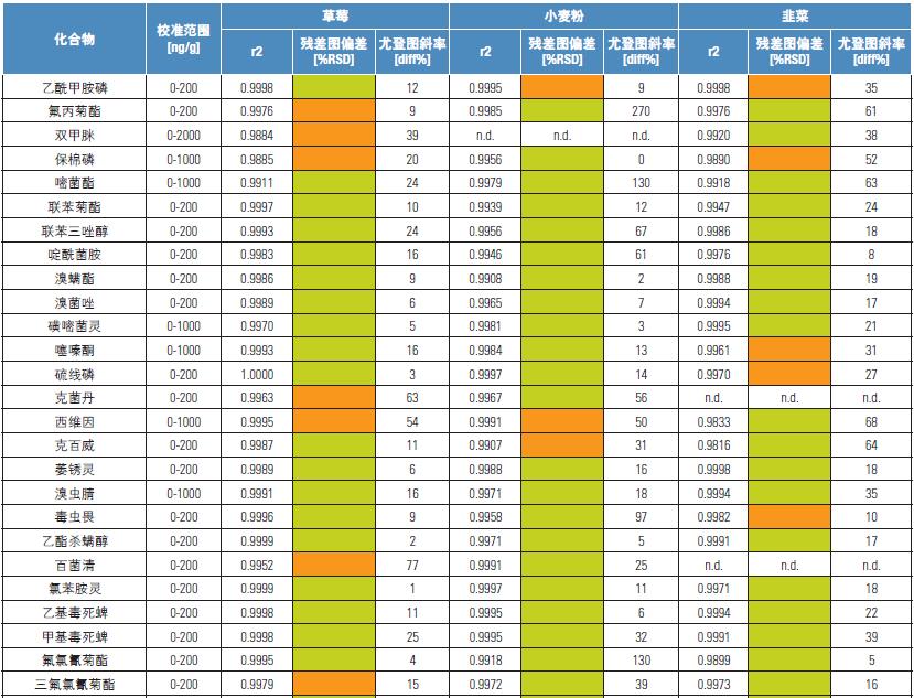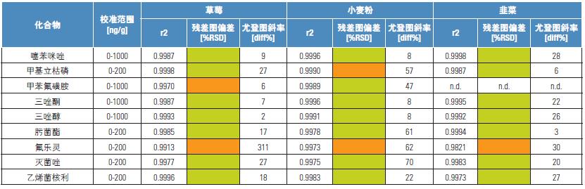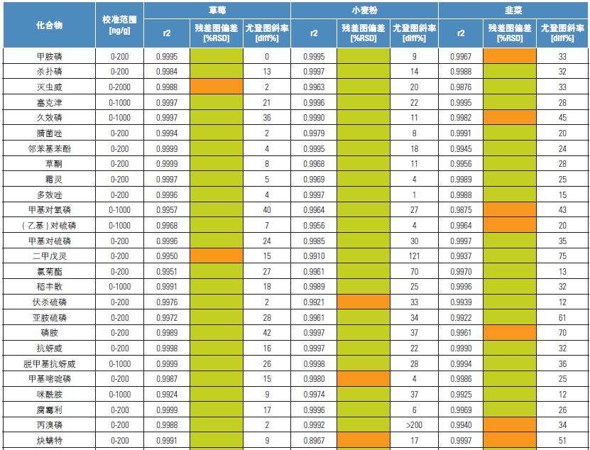 校準(zhǔn)曲線建立在六個濃度水平上(基質(zhì)匹配),每個濃度平行進樣兩次。根據(jù)所有基質(zhì)和內(nèi)標(biāo)物的校準(zhǔn)曲線,在整個校準(zhǔn)范圍內(nèi)計算了累加平均響應(yīng)因子做為內(nèi)標(biāo)的Rf 值。校準(zhǔn)濃度范圍分別為0-200,0-1000 和0-2000 ng/g 的三組化合物(取決于相關(guān)MRL 值)分別制備了校準(zhǔn)曲線(具體結(jié)果見表3)。校準(zhǔn)標(biāo)樣濃度水平的選取為校準(zhǔn)曲線范圍內(nèi)等距離分布。線性函數(shù)采用曼德爾擬合方法,曲線殘差應(yīng)小于可接受限的20%3。此外,由于沒有相關(guān)法規(guī)的規(guī)定,將相關(guān)系數(shù)值的最低限設(shè)定為0.985。由于與校準(zhǔn)標(biāo)樣濃度水平相關(guān)的LOQ 值太高,設(shè)定標(biāo)準(zhǔn)不適合甲氰菊酯和苯氟磺胺(LK),以及炔螨特(WF)。沒有采用加權(quán)函數(shù)。