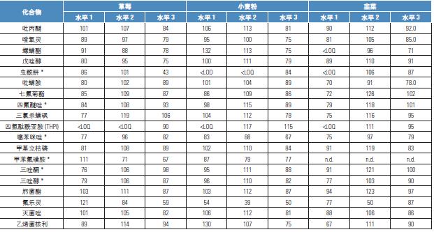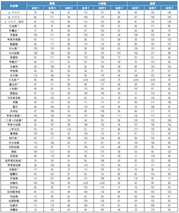 * 加標(biāo)濃度為50,100 & 500 ng/g ** 加標(biāo)濃度為100,200 & 1000 ng/g <LOD/LOQ – 加標(biāo)量低于LOD/LOQ 值