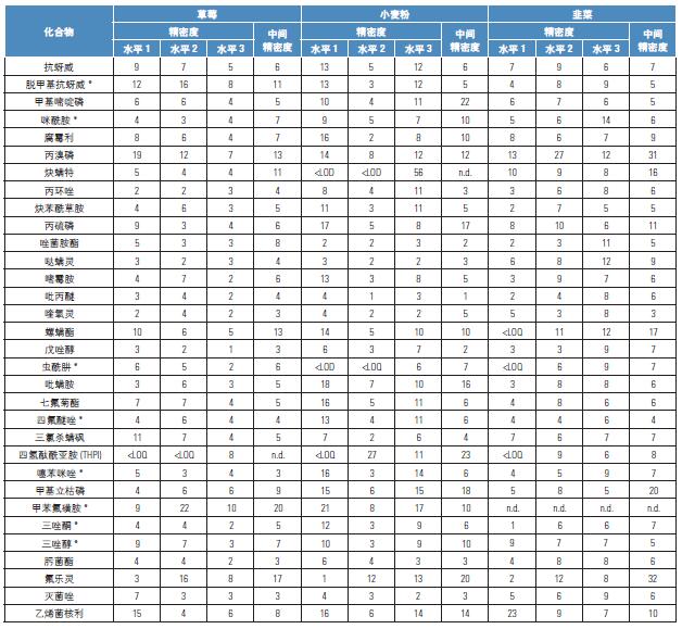 表5. 10 ng/g(水平1),20 ng/g(水平2)和100 ng/g(水平3)濃度下的方法精密度和中間精密度值[RSD%]