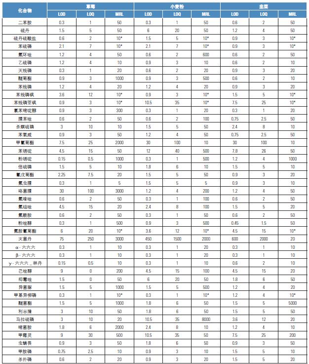 本方法驗證研究的目的是證明一種能應(yīng)用在一些有代表性的基質(zhì)(草莓、小麥粉和韭菜)中的多農(nóng)藥殘留(大約140 種優(yōu)先的農(nóng)藥)的日常分析的完整工作流程及解決方案(由Thermo Scientific 化學(xué)品、消耗品和儀器提供)。此方法符合現(xiàn)行法規(guī)的要求,方法的檢出限(LOQ)與MRL 值一致,具有良好的靈敏度1-4。