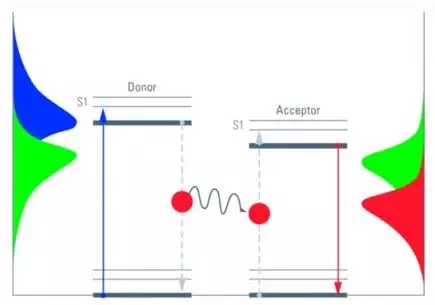熒光共振能量轉(zhuǎn)移發(fā)生在供體熒光分子與受體熒光分子的距離足夠近且供體的發(fā)射光譜與受體的吸收光譜相重疊時(shí)(10nm以內(nèi))。當(dāng)供體分子吸收一定頻率的光子后被激發(fā)到更高的電子能態(tài),在該電子回到基態(tài)前,通過(guò)共振實(shí)現(xiàn)能量向鄰近受體分子轉(zhuǎn)移的現(xiàn)象。發(fā)生FRET后,供體的熒光強(qiáng)度比它單獨(dú)存在時(shí)要低的多,而受體發(fā)射的熒光卻大大增強(qiáng)。通過(guò)FRET可以檢測(cè)分子間的相互作用及分子的折疊與構(gòu)象變化。