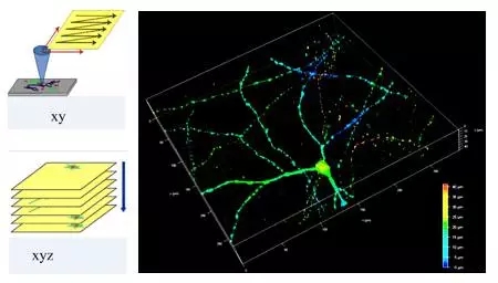 圖2 左:共聚焦顯微鏡的點(diǎn)掃描及Z軸層切模式;右:通過(guò)共聚焦顯微術(shù)對(duì)視網(wǎng)膜神經(jīng)元進(jìn)行三維重構(gòu)。