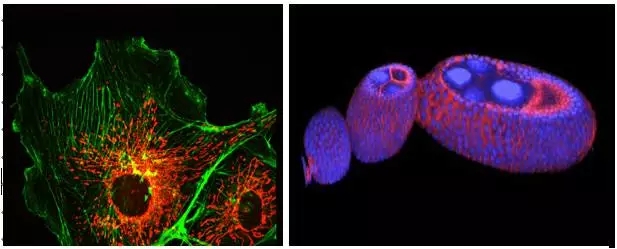圖3 左: 通過(guò)共聚焦顯微鏡對(duì)細(xì)胞微絲骨架(綠色,phalloidin)及線粒體(紅色,mitrotracker)結(jié)構(gòu)的清晰成像;右:通過(guò)共聚焦顯微鏡對(duì)果蠅卵結(jié)構(gòu)的三維重構(gòu)。