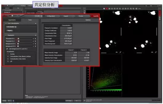 圖5 通過(guò)共聚焦軟件對(duì)熒光信號(hào)共定位情況進(jìn)行分析:選中quantify-colocalization選項(xiàng),通過(guò)ROI工具框選待分析區(qū)域,在窗口中間即顯示所選兩個(gè)通道的共定位參數(shù),包括Pearson系數(shù)、共定位比率等。