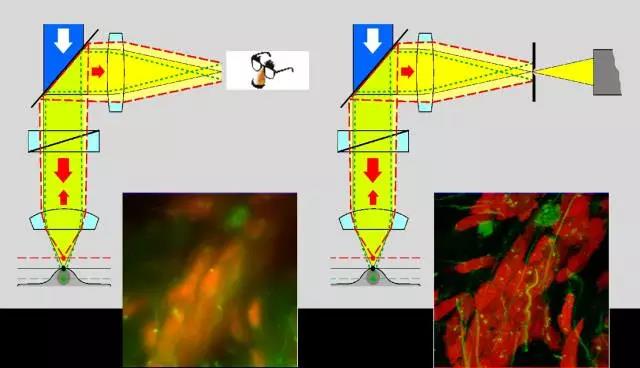 圖1 左右兩邊分別是普通寬場(chǎng)顯微鏡和共聚焦顯微鏡的成像光路,共聚焦顯微鏡利用點(diǎn)探測(cè)和點(diǎn)照明技術(shù)獲得高清晰度的圖像。