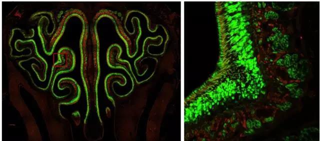 圖7 對(duì)小鼠鼻腔層斷面的大視野高清晰度拼圖。左:48個(gè)視野的自動(dòng)拼圖(40倍物鏡),右:對(duì)左圖中框選區(qū)域的放大。