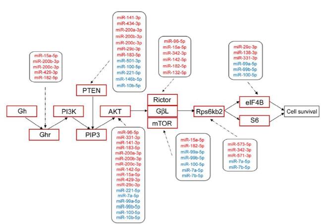 圖1: PIK/AKT通路中,差異miRNA與其靶基因的網(wǎng)絡(luò)圖