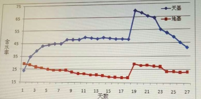 當(dāng)再次澆水后,水分急劇增加,打破原來的水分平衡,會出現(xiàn)高峰值并開始逐漸下降,這跟地基所測定的曲線圖是比較吻合的,圖中顯示為19-27天的曲線過程。
