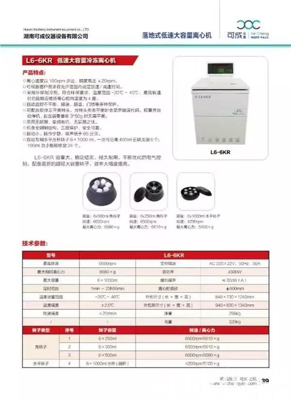 2、可成大容量血庫(kù)專用離心機(jī)L6-6KR一臺(tái),離心吊杯為圓形,血站專用水平轉(zhuǎn)子6×1000/ml,一次可分離400ml五聯(lián)血袋6個(gè);