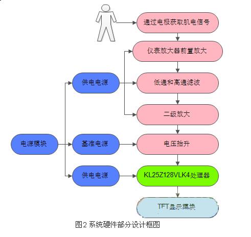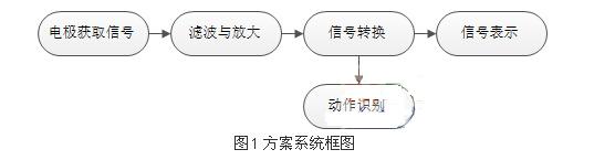 從上面設(shè)計框圖中可以看出,系統(tǒng)設(shè)計主要由5個部分組成,其中濾波與放大是電路設(shè)計的主要部分,因為如果采集不到表面肌電信號后面的工作將無法進(jìn)行。信號轉(zhuǎn)換主要是做A/D轉(zhuǎn)換工作,信號表示就是要繪制表面肌電圖。