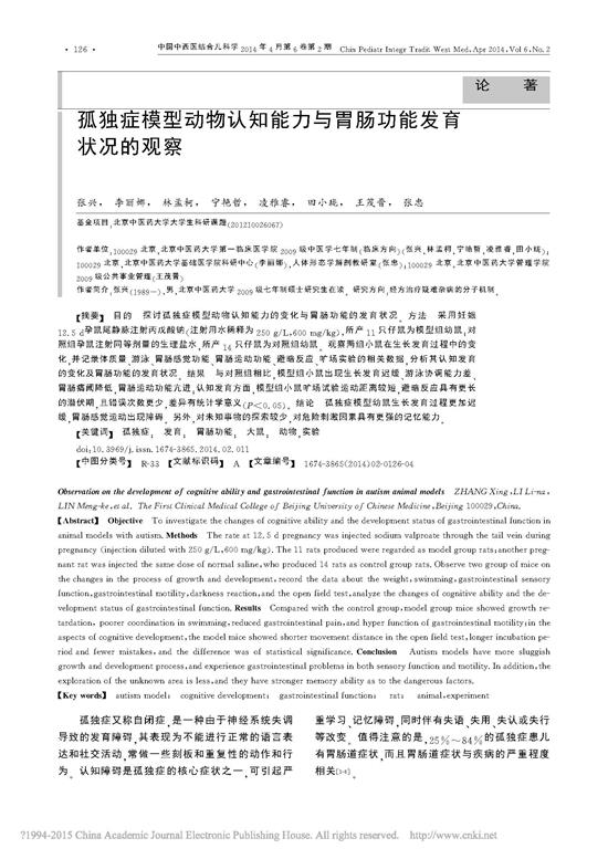孤獨(dú)癥模型動(dòng)物認(rèn)知能力與胃腸功能發(fā)育狀況的觀察_張興