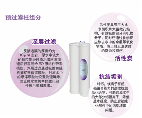 以自來水為進水的實驗室純水設(shè)備,預(yù)過濾是第一步。主要用來除掉原水中的顆粒物雜質(zhì)、余氯等氧化物質(zhì),防止結(jié)垢,以保障主機的純化效率和使用壽命。