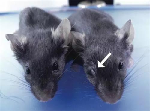圖3 左邊是正常小鼠。右邊小鼠的一只眼睛比正常。^所示;小眼)。這是C57BL/6小鼠的常見情況。