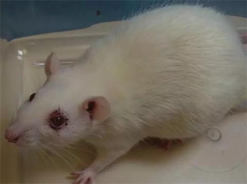 圖6 該白化大鼠出現(xiàn)血淚或紅淚。該紅色物質(zhì)由眼后的哈德氏腺產(chǎn)生。是大鼠應(yīng)激或患病時(shí)的普遍癥狀。