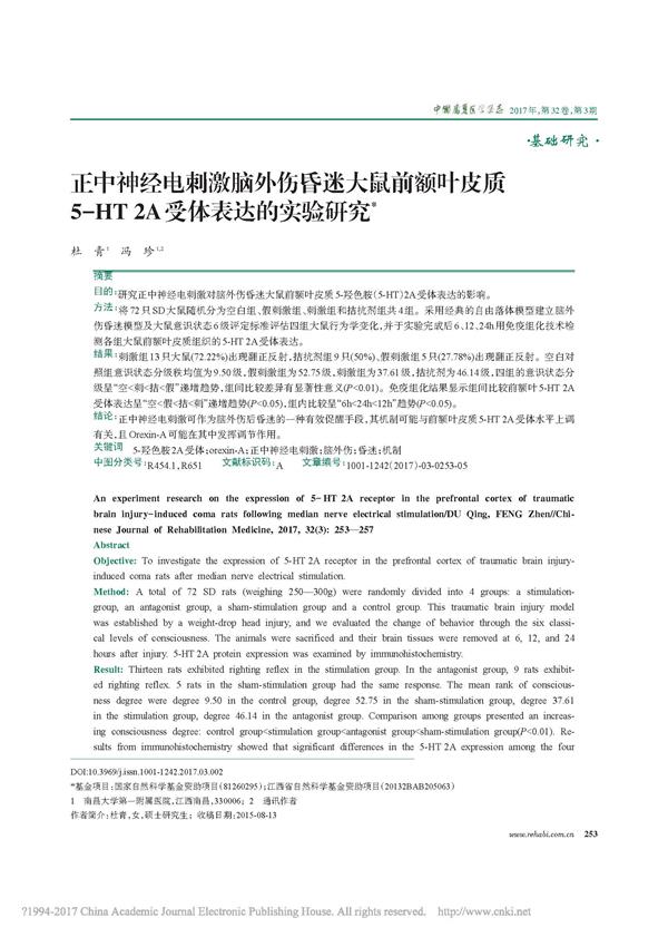 正中神經電刺激腦外傷昏迷大鼠前額_省略_質5_HT2A受體表達的實驗研究_杜青