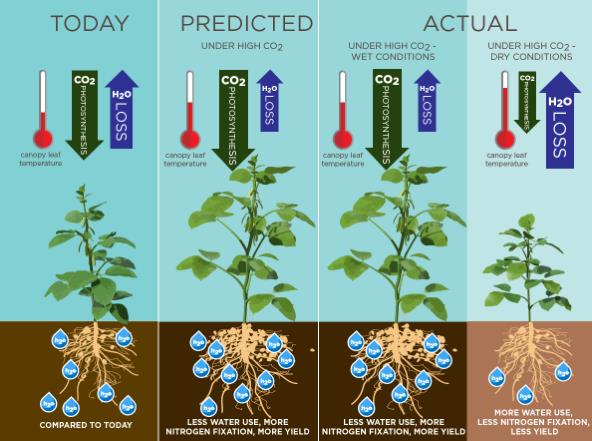 Leakey 教授等利用 BTC-100 微根窗根系觀測(cè)、土壤水分剖面監(jiān)測(cè)、光合作用測(cè)量及 FACECO2 升高裝置等儀器技術(shù),在大田內(nèi)全面監(jiān)測(cè)作物(大豆)在 CO2 升高、干旱脅迫條件下,土壤剖面水分狀況、作物地下根系(細(xì)根)及根瘤生長(zhǎng)、地上葉面積、光合作用、氣孔導(dǎo)度、冠層溫度等參數(shù)指標(biāo),證明以前普遍認(rèn)為的 CO2 升高可以保持土壤中水分、增加作物產(chǎn)量并抵消干旱脅迫作用,都是片面的甚至是錯(cuò)誤的;隨著氣候變化導(dǎo)致的溫度升高、干旱程度的增大及極端氣候天氣,全球變化的負(fù)面影響將波及到全球糧食主產(chǎn)區(qū),人類迫切需要找到適應(yīng)性對(duì)策。