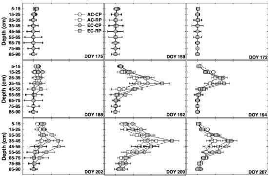 2009-2011(3 年)生長(zhǎng)季節(jié)不同日期 DOY(days of year)不同土壤深度大豆根長(zhǎng)密度 RLD(cm/cm3)。虛線與空心圓圈是指在環(huán)境 CO2、對(duì)照降雨量條件下(AC-CP),虛線與空心方塊指環(huán)境 CO2、干旱脅迫條件下(AC-RP),實(shí)線與灰色實(shí)心圓圈指 CO2 升高、對(duì)照降雨量條件下(EC-CP),實(shí)線與實(shí)心灰色方塊指 CO2 升高、干旱脅迫條件下(EC-RP)
